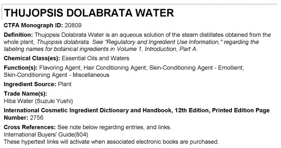 기원 및 정의 : 이 원료는 나한백 Thujopsis dolabrata의 전초를 수증기 증류하여 얻은 수용액이다.